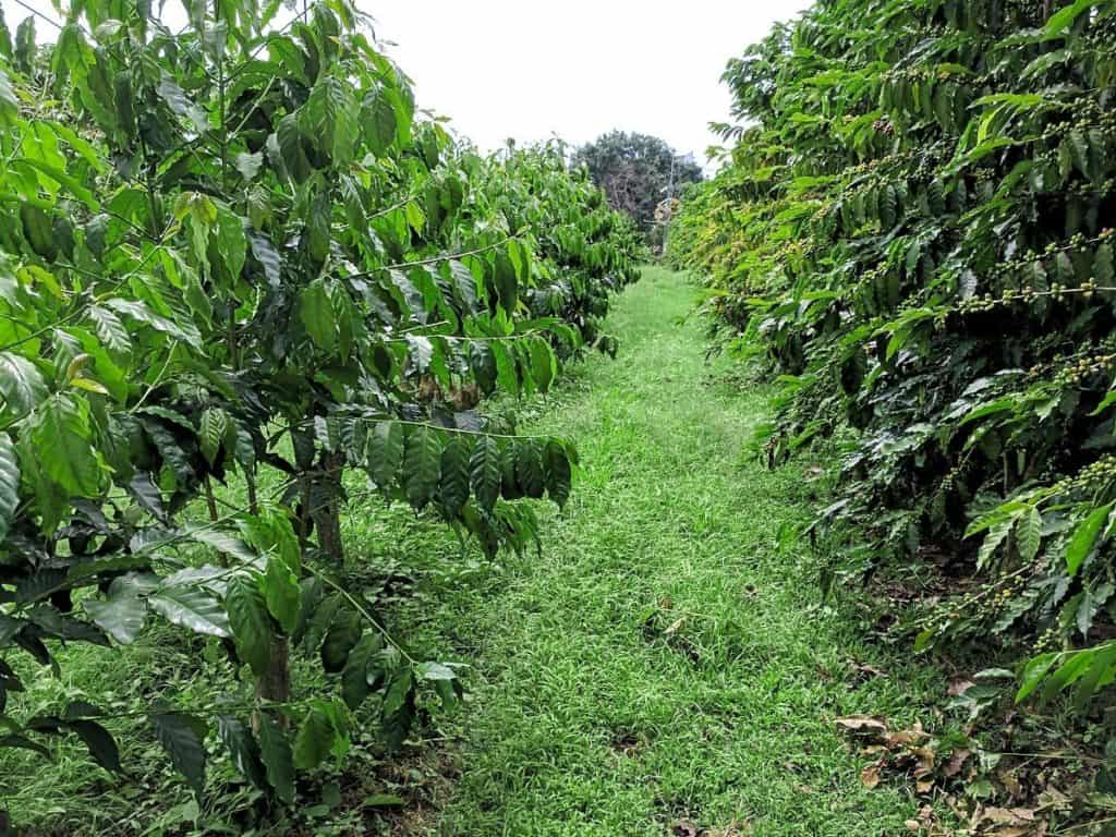 Coffee trees are pruned to a low height so it is easier to pick the cherries, however, if it's cut too short too soon they fall over.