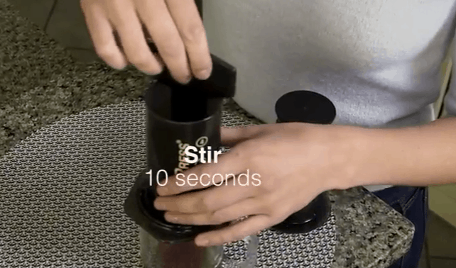 Step 9: Push the cap into the top of the brewing chamber. Next, place the AeroPress over the container, and start pushing the plunger down. To apply the right amount of pressure just lean onto the plunger, you do not need to force it down (If it is too easy to press down, you need a finer grind and vice versa).